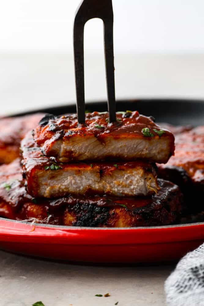 - Place the marinated pork chops on the preheated and well-oiled grill, and discard the marinade. Cook the pork chops for about 6-7 minutes on each side. They are safe to eat when the internal temperature reaches 145 degrees Fahrenheit.