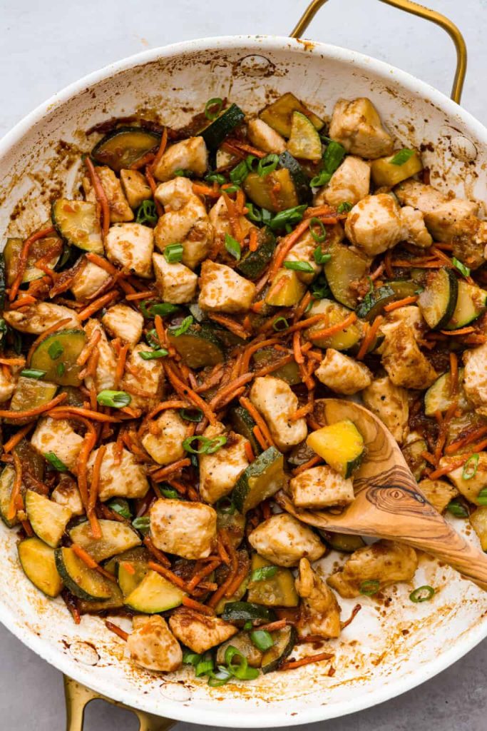- To the pan add the carrots, zucchini, and ½ cup hibachi sauce, saute until the chicken is cooked through and the sauce has reduced. Add more sauce as needed.